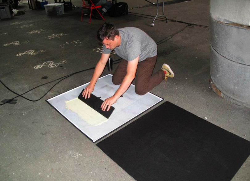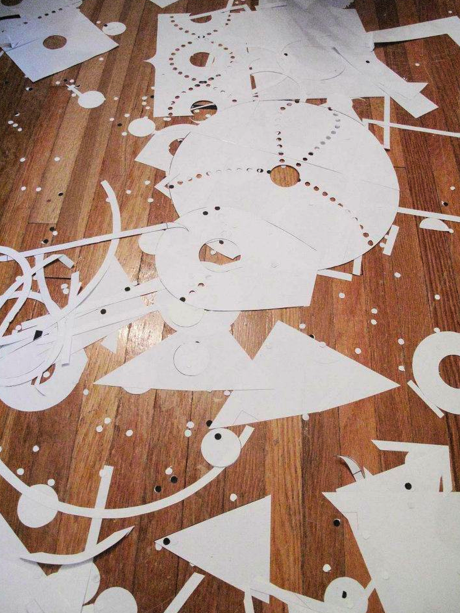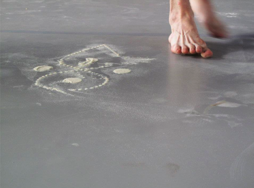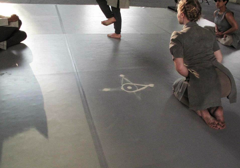 “For the IN HABIT project I have made a set of 16 stencils to be printed during the performances. This unusual aspect of the project is perhaps the most direct reference to the South Indian tradition of Kolam drawing. I found the idea of constructing fragile and ephemeral images using rice powder extremely inspiring, and wanted to include this gesture in the performance. When working on the designs I was attempting to maintain an aesthetic connection with the traditional Kolam lines, while infusing it with a diagramatic, map-like forms. The stencils offer a glimpse into the conceptual and structural underpinning of each dance. Each of the 16 dance sections opens with the design printed on stage using the rice powder. Much like with the street Kolam, the designs are vulnerable to the activity of the day. As you can see in the images, the prints are transformed during the performance, and new compositions emerge.”