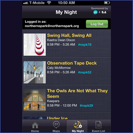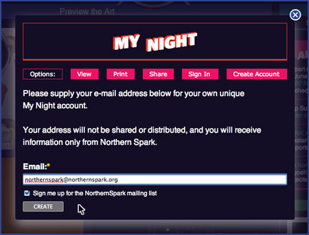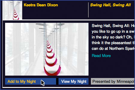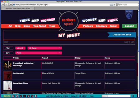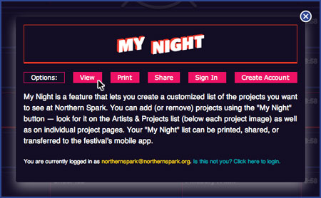My Night is a feature that lets you create a customized list of the projects you want to see at Northern Spark. Add (or remove) projects using the “My Night” button — look for it on the Artists & Projects list as well as on individual project pages.Your “My Night” list can be printed, shared, or transferred to the festival’s mobile app.