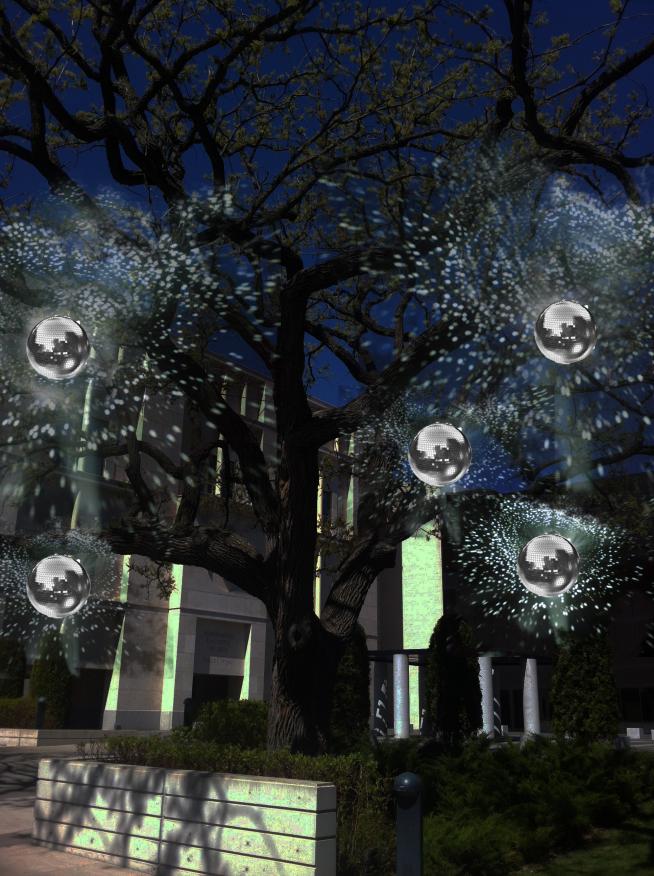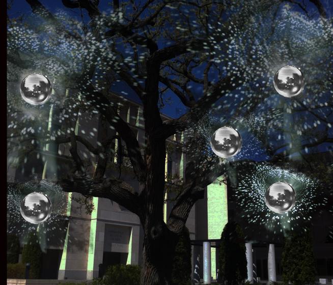 Celebrate honors the majestic maple on the grounds of the Minneapolis Institute of Art at the corner of 24th St. and 3rd Ave. Rising more than 60′ into the sky, this tree is a wondrous specimen. For Northern Spark it will be adorned with multiple mirrored balls and lights, gifting this tree with its own celebratory party. The reflected light will bring the normal dappled light that drifts through its canopy to the nighttime. Stop by to marvel at the sight and think about how quickly our celebration of the natural can turn artificial.