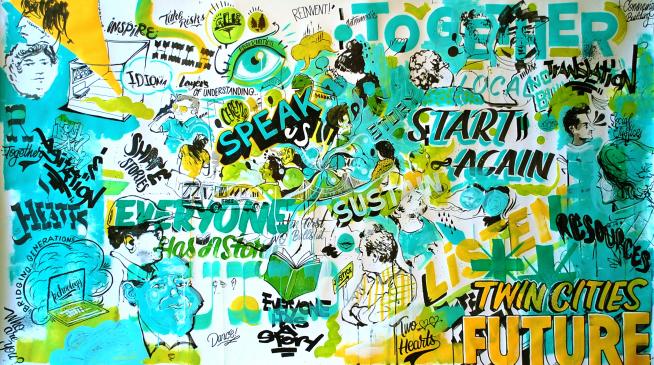 Over the last three months, Intermedia Arts has invited over 60 artists, curators, youth, board, staff, neighbors and partners together to vision with us about the future of our property and facility. From green roofs to lip couches, natural light to art studios, food markets to dance clubs, the idea have ranged from the practical to the whimsical and everything in between. The Dream Lab exhibition showcases the visions and dreams from our community in a mural installation.
