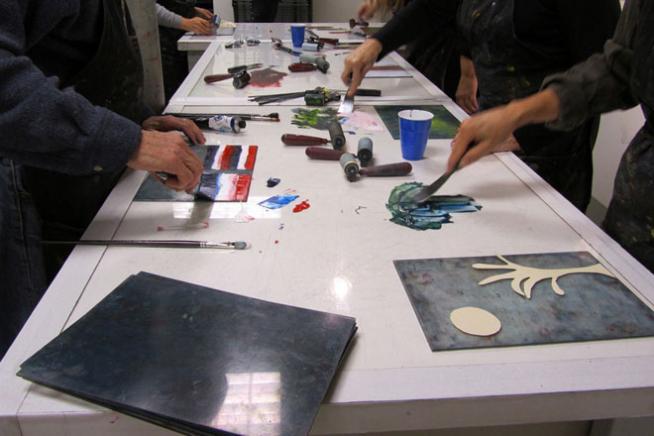 adhere to light posts, bike racks, and parking meters along the Lake Street sidewalk in front of Highpoint. Print relief block images onto glowing paper lanterns that can be strung along the Luminary Promenade or in the rain garden behind Highpoint’s studio.