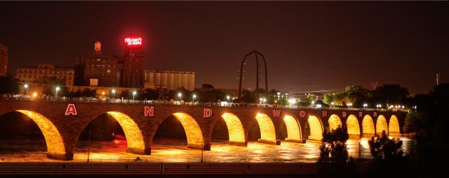 The Stone Arch Bridge, overlooking St. Anthony Falls and connecting the east and west banks of the Mississippi River in Minneapolis’s historic milling district, is a primary site of Northern Spark.