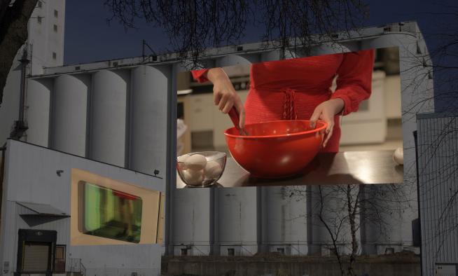 Mom’s Cookies is a series of short silent videos showing packaged convenience foods prepared from start to finish by a well-coiffed mother figure. The videos will be projected onto mill buildings near St. Anthony Falls on the Mississippi River.